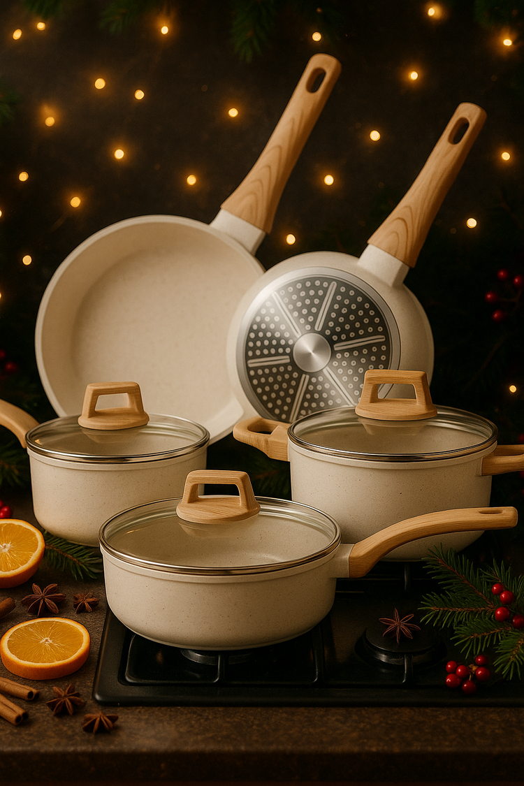 Tämä ylellinen valkoisen graniitin sävyinen keittoastiasto yhdistää huippuluokan tarttumattoman pinnoitteen, kestävän die cast -valutekniikan ja skandinaavisen puujäljitelmädesignin.
