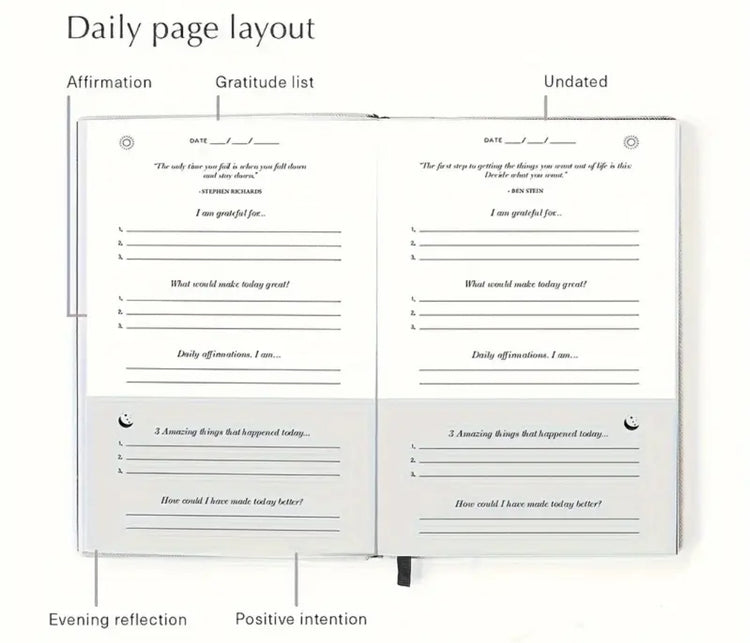 Gratitude Flow Journal on kaunis ja käytännöllinen kiitollisuuspäiväkirja, joka auttaa sinua pysähtymään arjen keskellä ja keskittymään positiivisiin asioihin 🌿✨. Päivittäinen täyttö vie vain muutaman minuutin, mutta tuo valtavasti mielenrauhaa ja iloa. Kirjassa voit kirjoittaa aamuin illoin kiitollisuuden aiheita, päivän tavoitteita, positiivisia ajatuksia ja iltaisin reflektoida, mikä teki päivästäsi merkityksellisen.