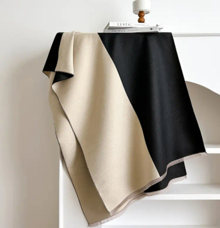 Ylellinen, kaksivärinen huivi, joka toimii sekä näyttävänä kaulahuivina että shaalina.