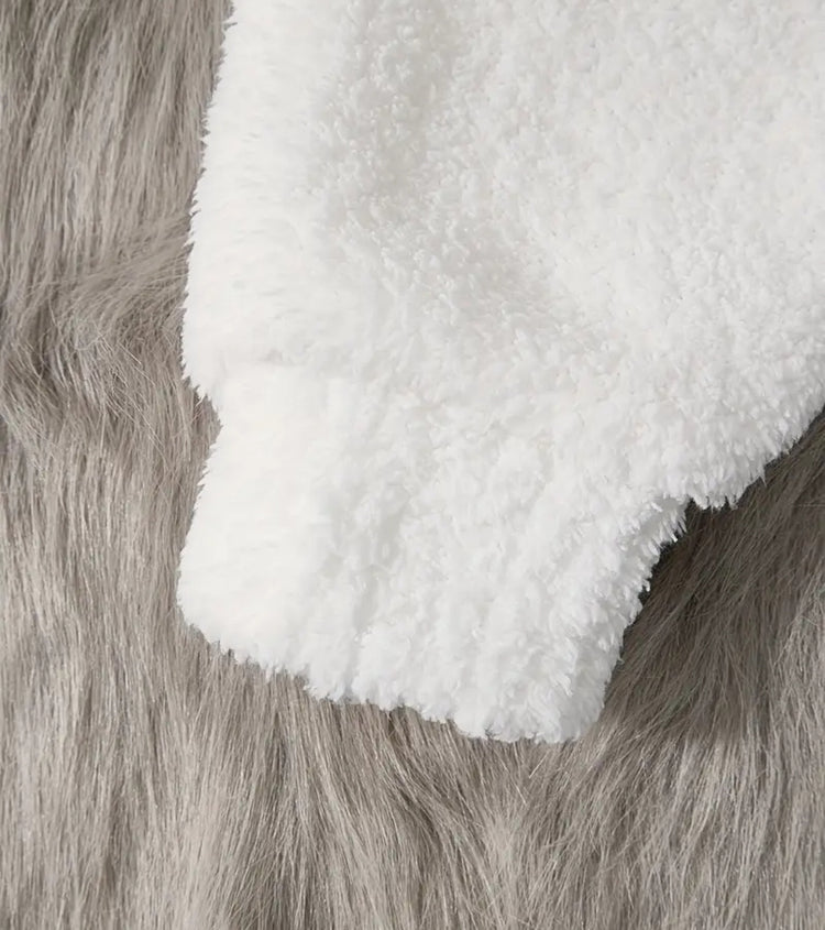 Samettisen lämmin “teddy”-materiaali tuntuu kevyeltä ja pehmeältä ihoa vasten, ja yksivärinen valkoinen sävy tuo raikkaan ja rauhoittavan ilmeen.