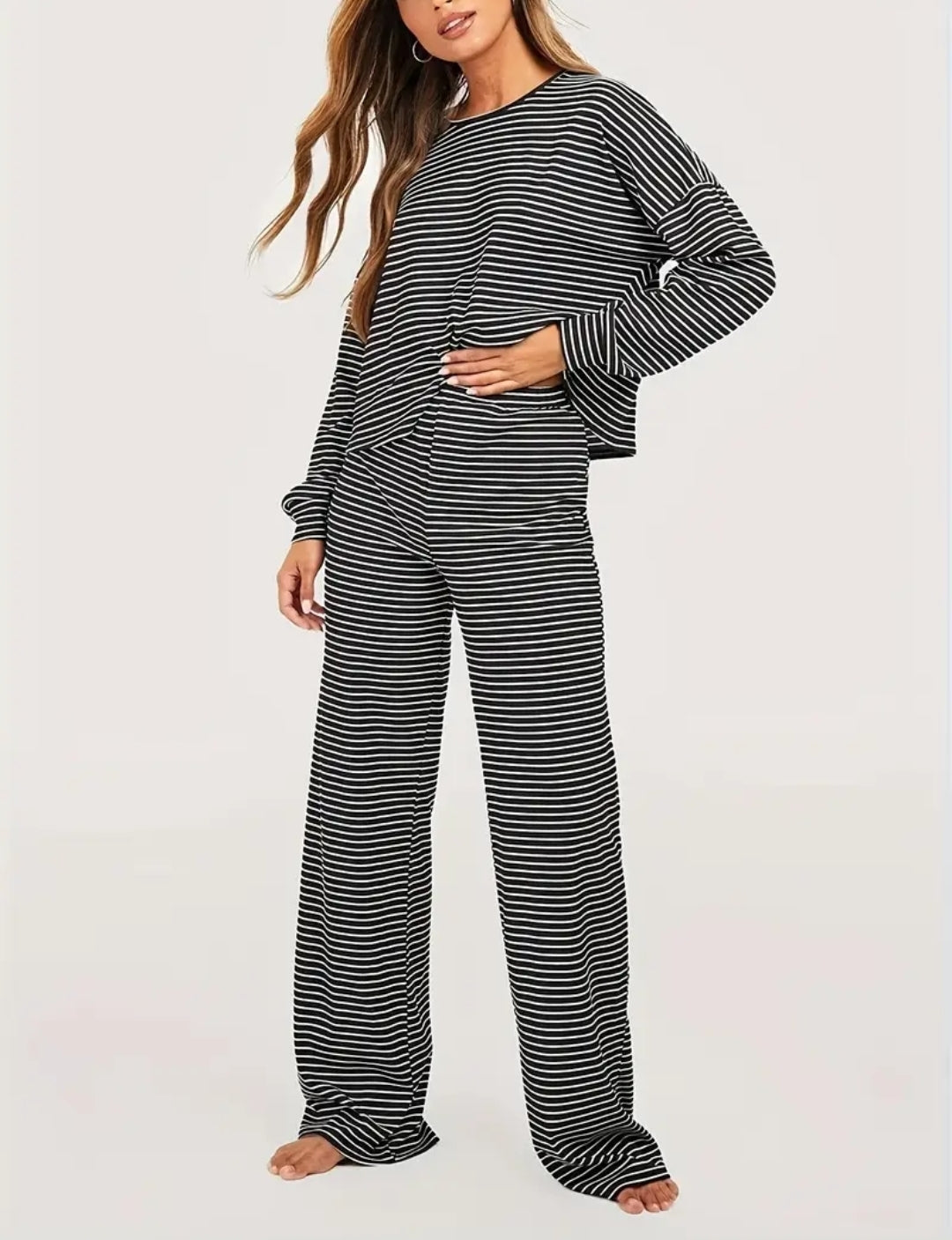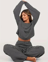 Tämä Soft Stripes Lounge Set on täydellinen yhdistelmä rentoa mukavuutta ja ajattoman raikasta tyyliä. Mustavalkoinen raitakuosi tekee asusta sekä klassisen että modernin — täydellinen koti-iltoihin, matkustamiseen tai rennon tyylikkääseen arkilookiin.
