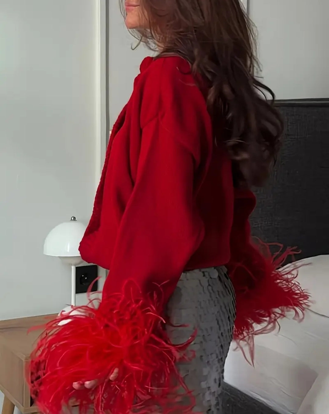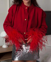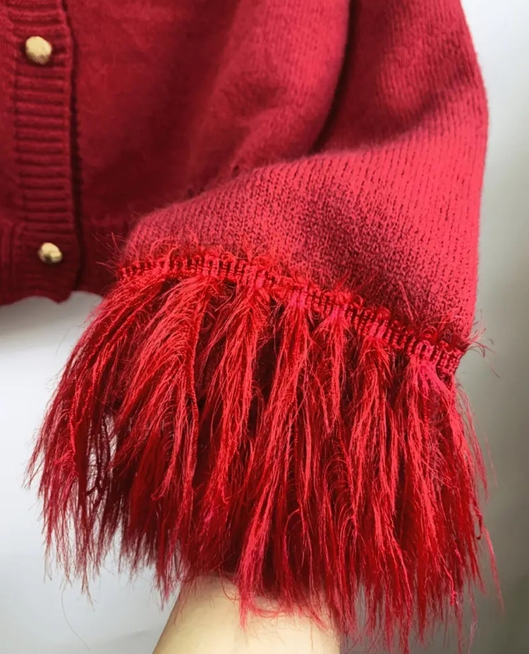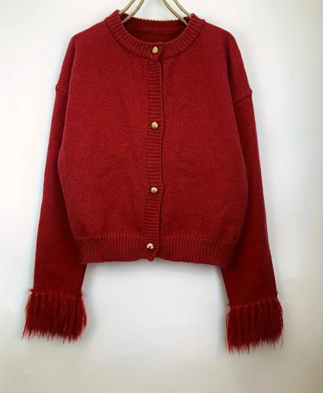 Ruby Feather Knit Cardigan on täydellinen yhdistelmä arjen mukavuutta ja näyttävää tyyliä. Tämä upea neule jakku tuo luksusta jokaiseen päivään – pehmeä punainen neulos, kultaiset napit ja hihansuita koristavat näyttävät höyhenet luovat trendikkään ja naisellisen ilmeen. 💋
