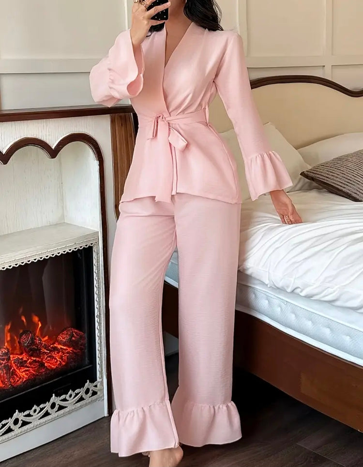 Tämä kaksiosainen setti kietoo sinut kevyesti ympärilleen – vyötärölle solmittava takki korostaa kauniisti muotoja, ja frillalahkeet tuovat lookiin ripauksen romanttista luksusta.