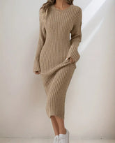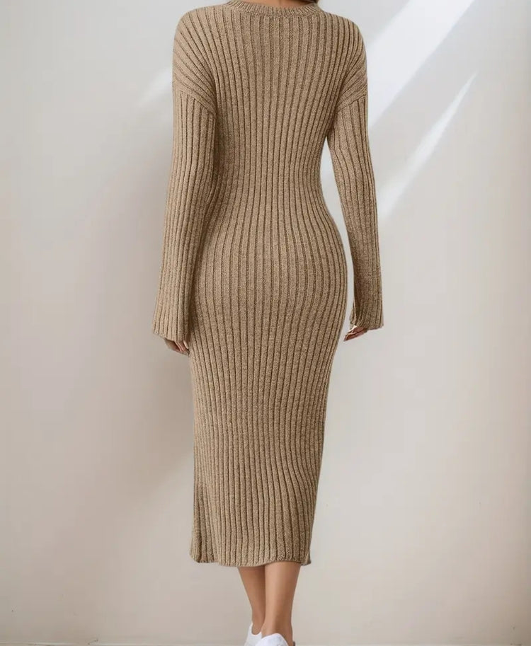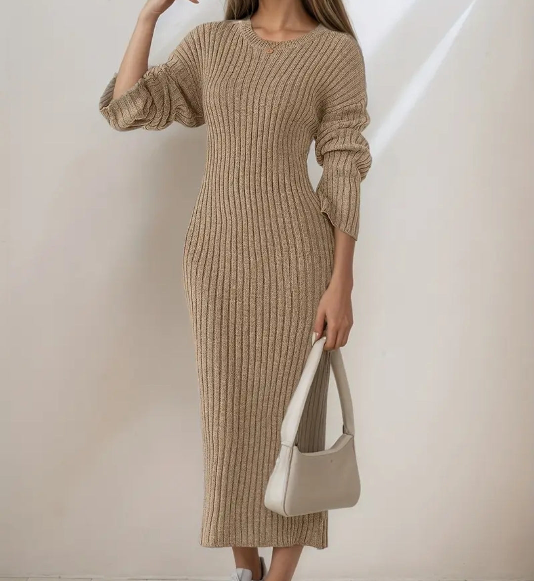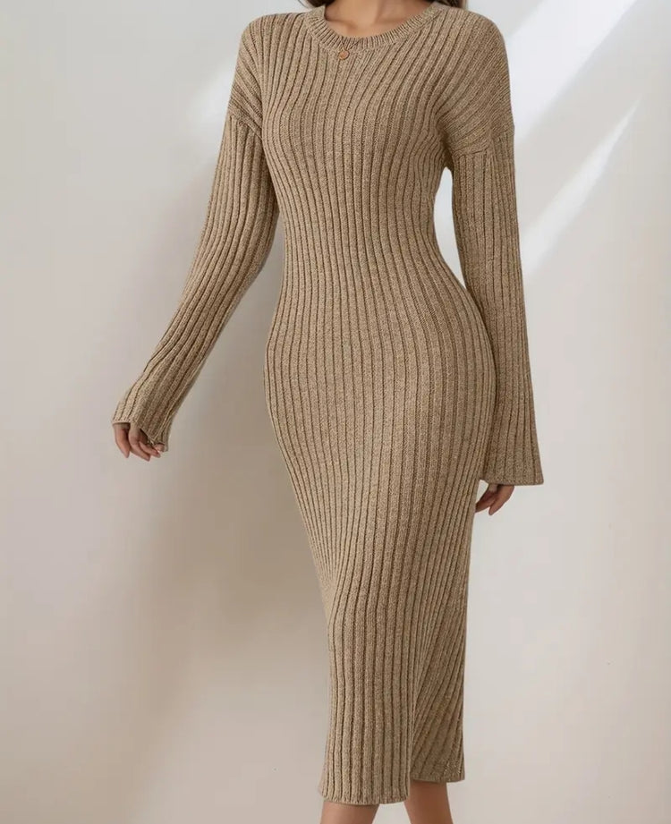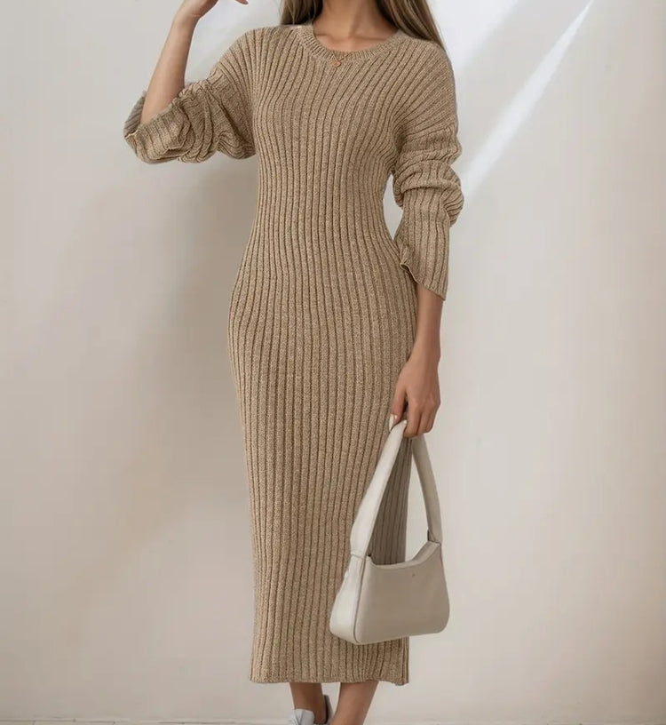 Tämä tyylikäs beige ribbineulemekko on täydellinen valinta niin arkeen kuin juhlaan. Joustava materiaali (95 % polyesteri, 5 % elastaani) myötäilee kauniisti vartalon muotoja ja tuntuu mukavalta päällä. Pitkät hihat ja midi-mittainen helma tekevät mekosta ajattoman ja monikäyttöisen. Helppo yhdistää niin korkokenkien kuin maihareiden kanssa.
