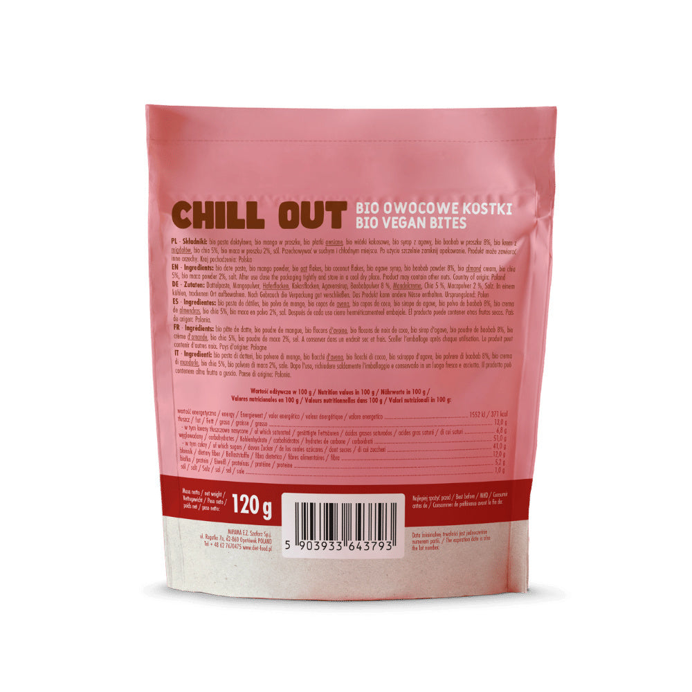 Bio Bites (fruit cubes) are the perfect choice for people who appreciate healthy and natural food. Made of 100% organic ingredients, without unnecessary additives, which guarantees the preservation of full nutritional value. ✅ 100% organic fruits and vegetables ✅ 100% vegan product ✅ no added sugar ✅ no artificial flavors ✅ without dyes and preservatives Bio Vegan Bites CHILL OUT are based on bio date paste with maca, mango, coconut, baobab, and chia. The product is 100% vegan, perfect for vegan and vegetarian diets. Fruit cubes, thanks to their small size, are the perfect snack for travel, work, or school. The cubes are made by hand. Bio Bites are available in 5 different flavors: SATISFY - based on bio date paste with orange, almonds, and cocoa. PROTECT - based on bio date paste with banana, pineapple, almonds, chia, hemp seeds, bio guarana, and vitamin C. ACTIVITY - based on bio date paste with cocoa, almonds, coconut, baobab, and bio whey protein. FEEL GOOD - based on bio date paste with pineapple, almonds, coconut, baobab, oatmeal, and probiotics. CHILL OUT - based on bio date paste with maca, mango, coconut, baobab, and chia.How to consume