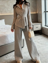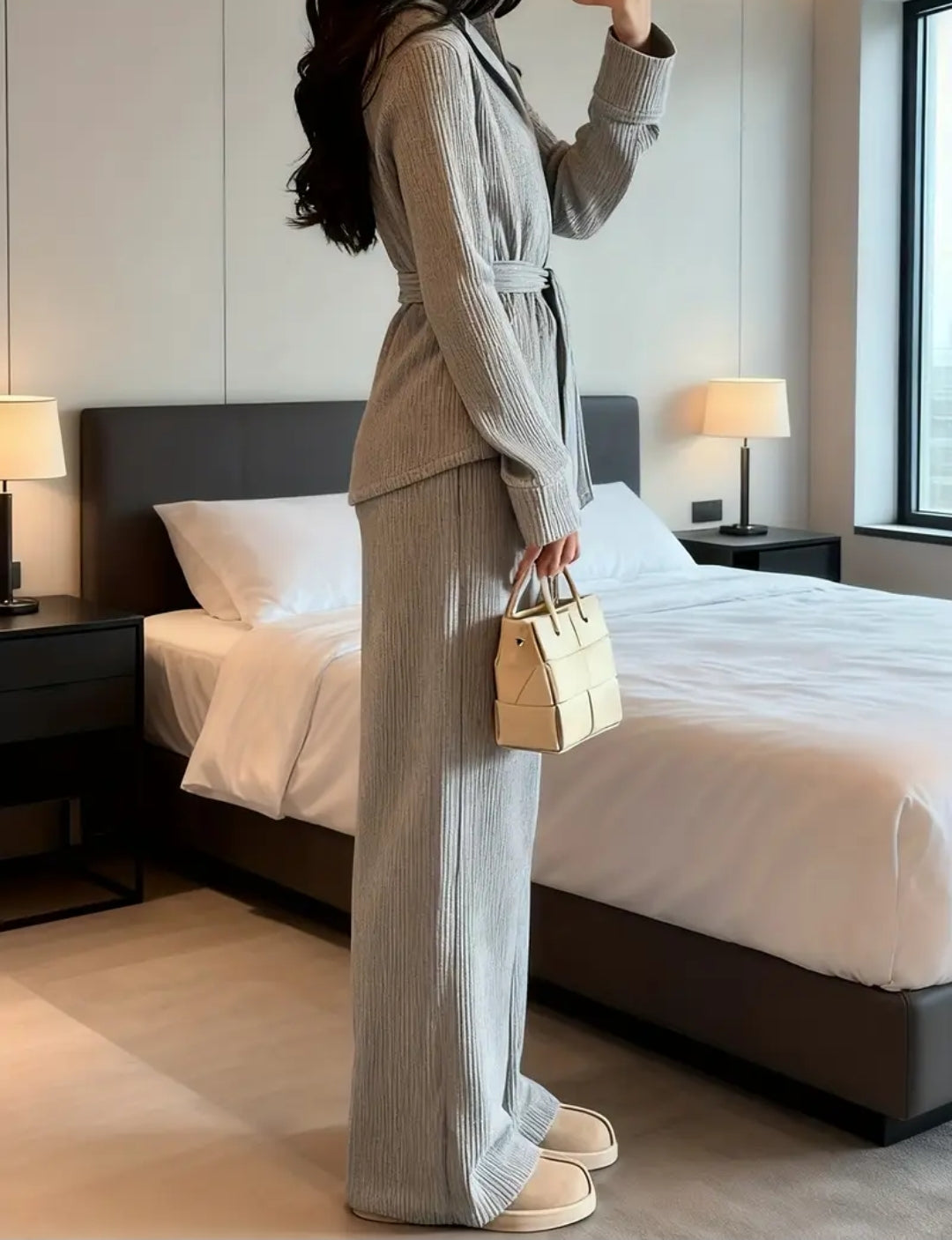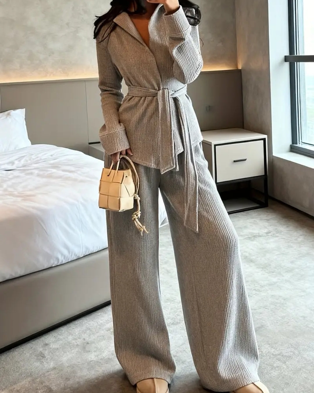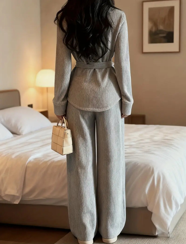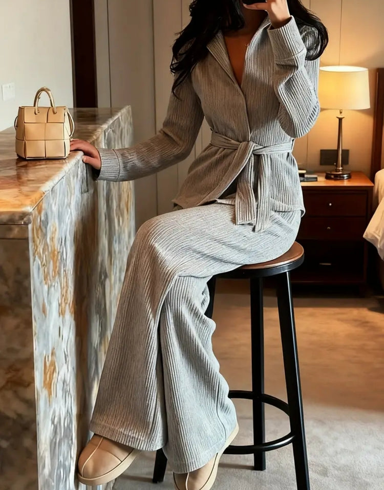 Modernes Eleganz-Strickset – harmaa neuleasu vyöllä