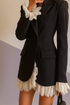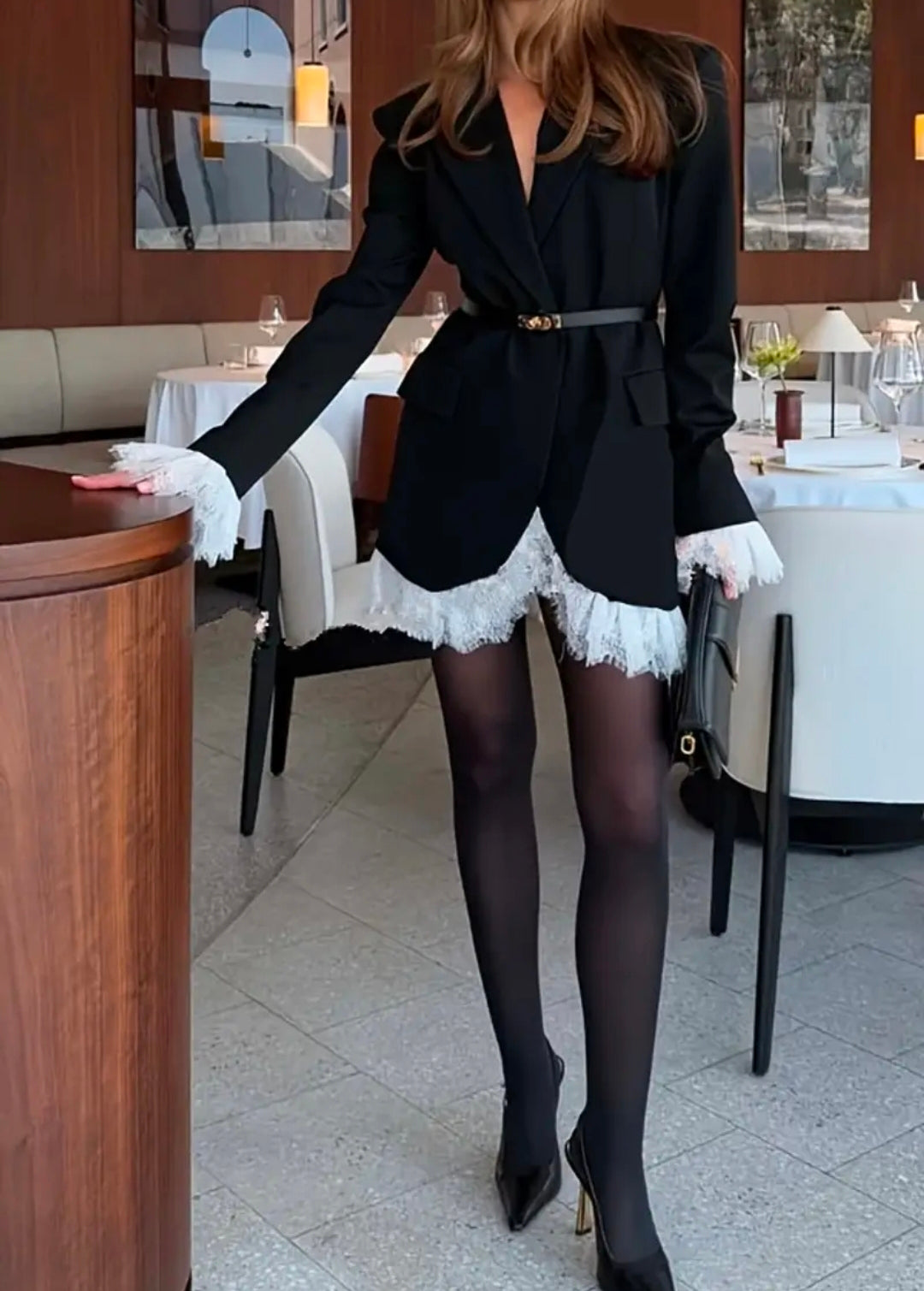 Elegance Lace-Trim Blazer Dress on statement-mekko, joka yhdistää blazerin skarpin ryhdin ja pitsin pehmeän ylellisyyden.