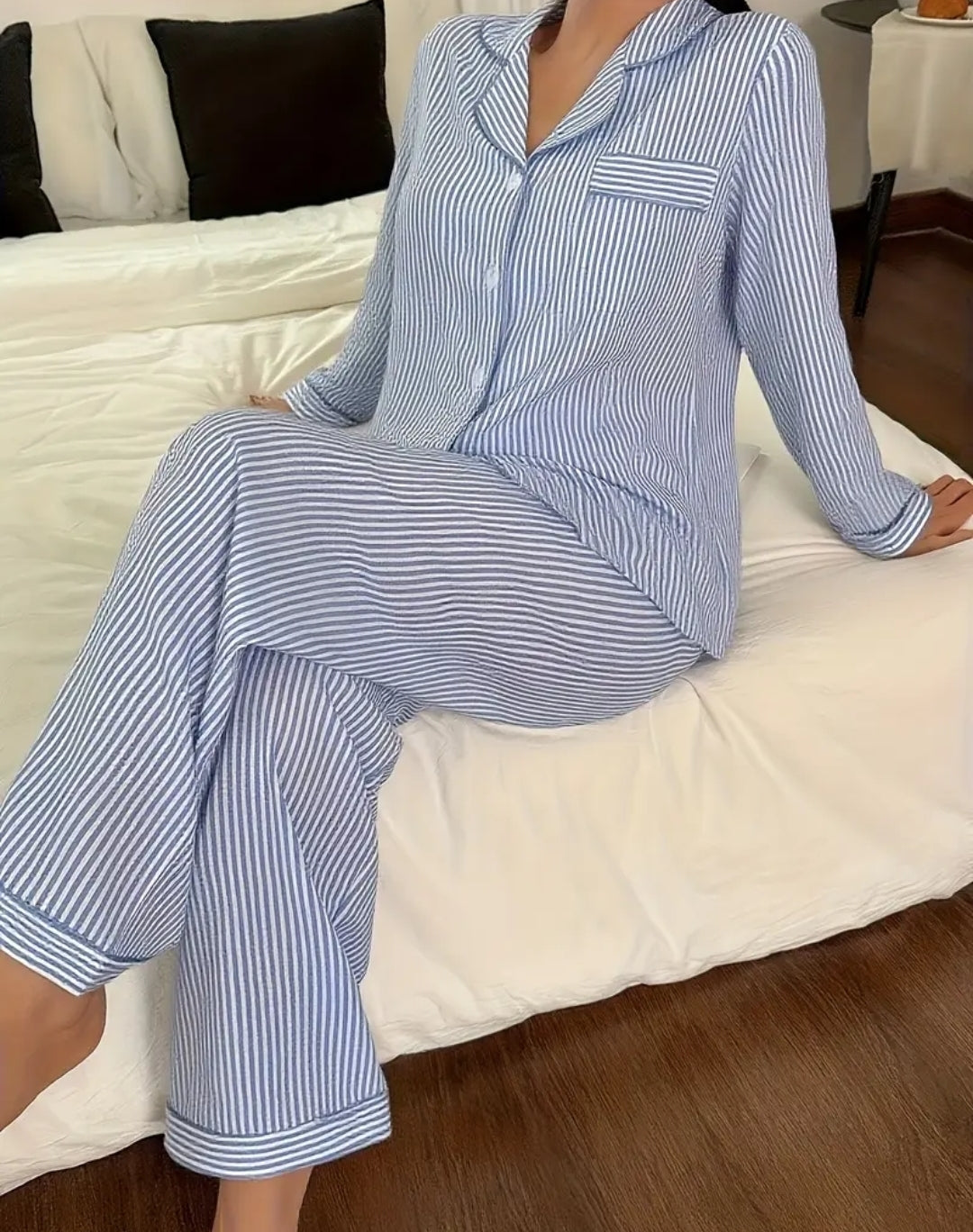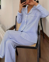 💙 Modern Stripes Pyjama Set – rennon tyylikäs uniasu, jossa yhdistyy skandinaavinen selkeys ja pehmeä arjen luksus.