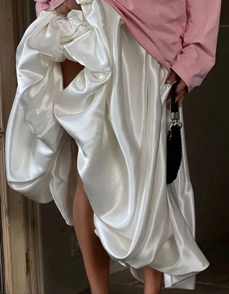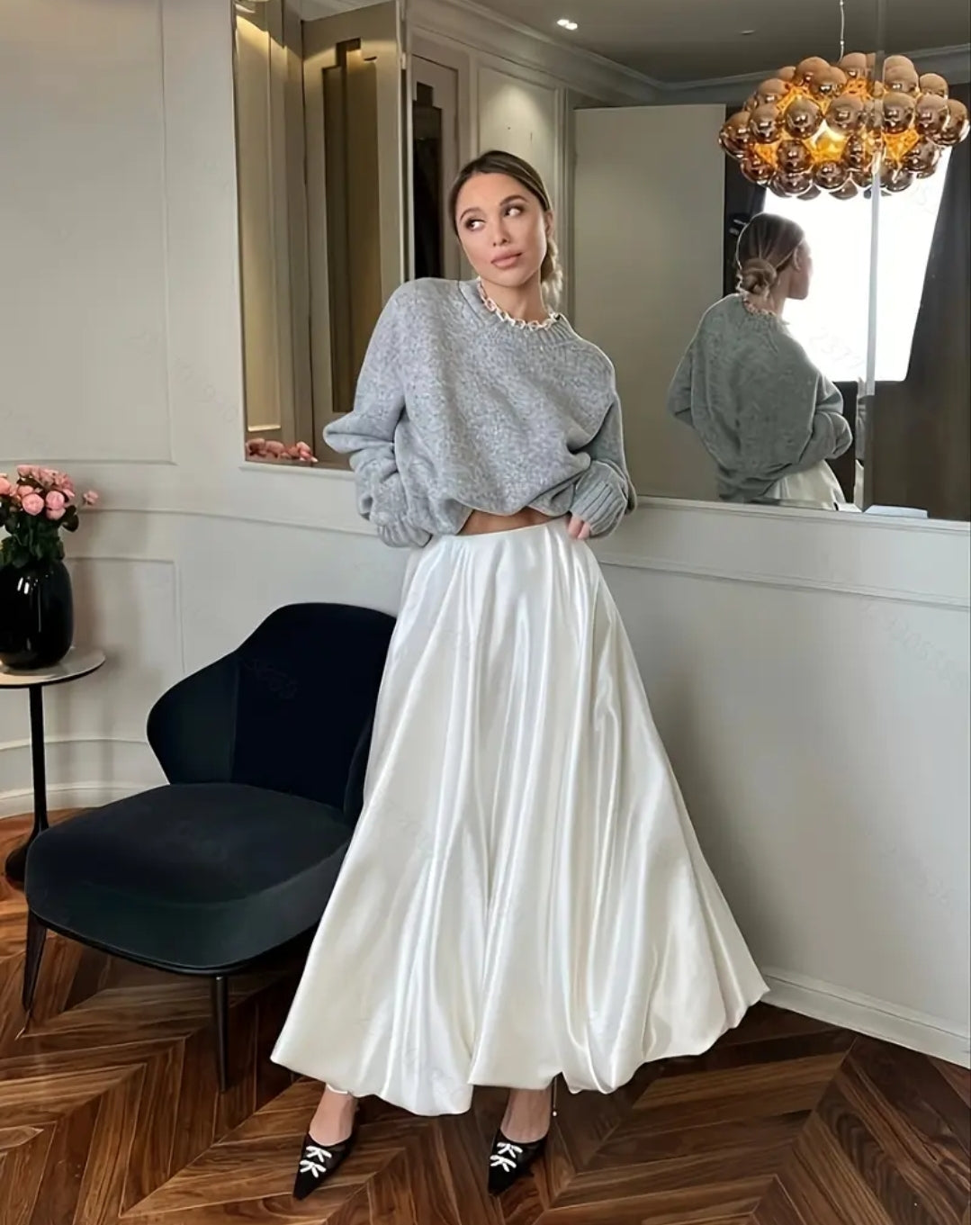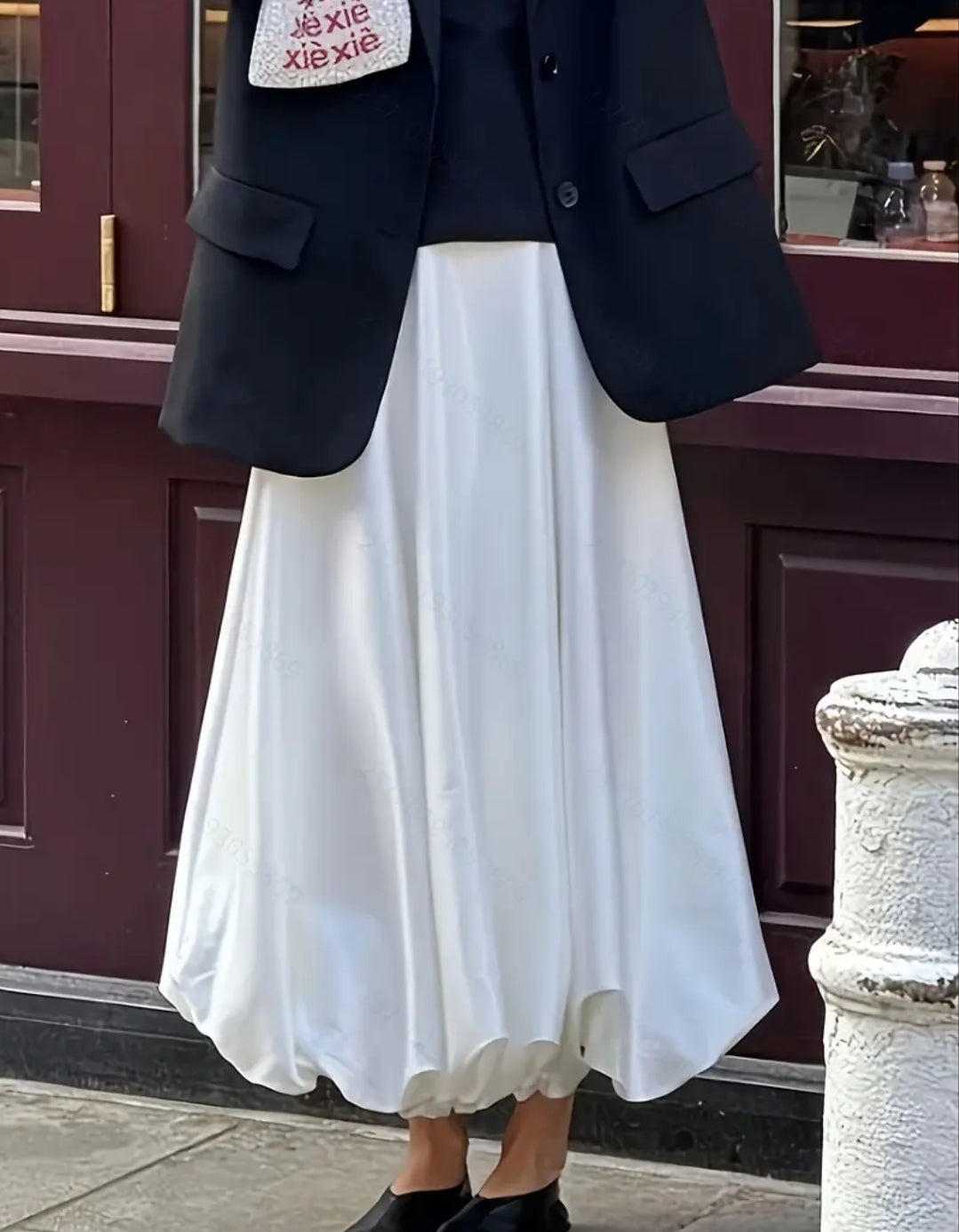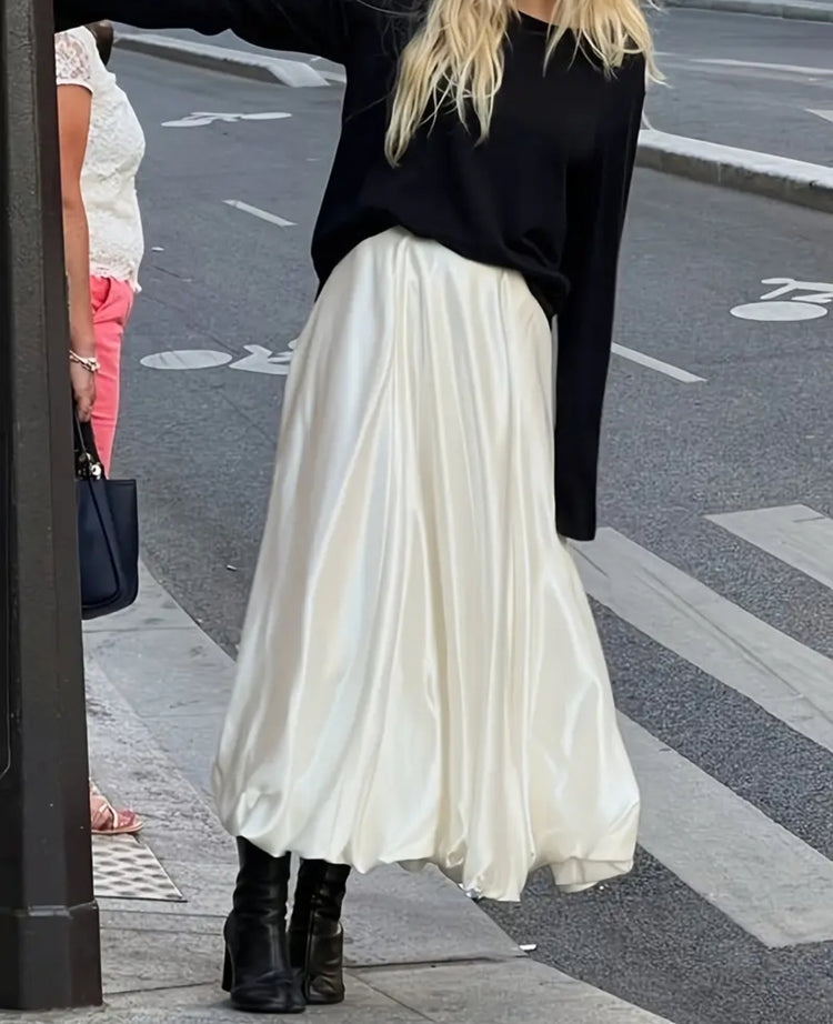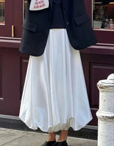Cloud Satin Balloon Skirt on tyylikkyyden ja näyttävyyden täydellinen yhdistelmä. Tämä upea satiininen hame laskeutuu ilmavasti ja luo volyymia ainutlaatuisella balloon-helmalla. Hameen kiiltävä pinta heijastaa valoa kauniisti ja tekee siitä täydellisen juhliin, illallisille tai eleganttiin arkilookiin yhdistettynä neuleeseen tai nahkatakkiin. 🤍