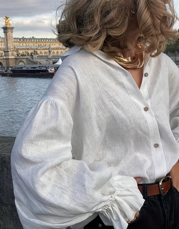 Tuo asuusi ripaus pariisilaista eleganssia Paris Breeze Blousella. Tämä ilmava valkoinen paita hurmaa näyttävillä pussihihoilla ja kevyesti laskeutuvalla pellavamaisella kankaalla. Helposti yhdistettävä klassikko toimii täydellisesti farkkujen, hameen tai siistien housujen kanssa – niin arkeen kuin rennompiin juhlahetkiin.