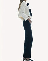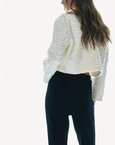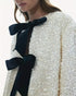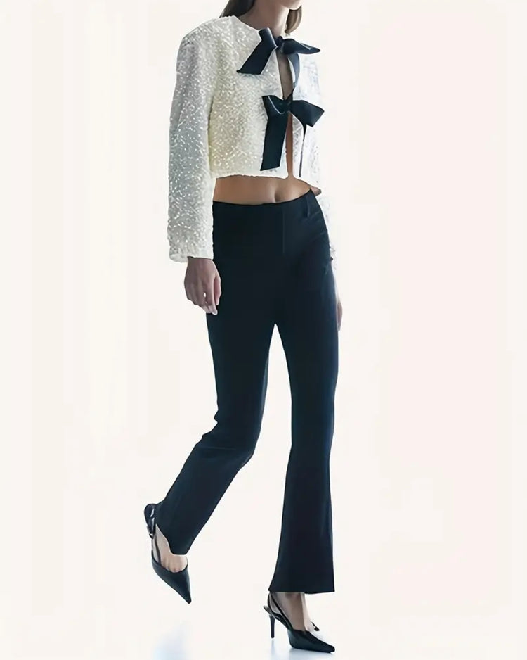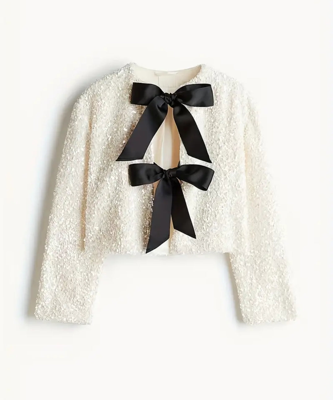 Pearl Elegance Sequin Jacket on tyylikkyyden ja naisellisen luksuksen täydellinen yhdistelmä. Valkoinen paljettipinta heijastaa valoa kauniisti, ja suuret satiiniset mustat rusetit tekevät jakusta näyttävän ja elegantin katseenvangitsijan. Tämä juhlava jakku sopii täydellisesti iltatilaisuuksiin, juhliin tai moderniksi lisäykseksi yksinkertaiseen farkkuasuunkin.