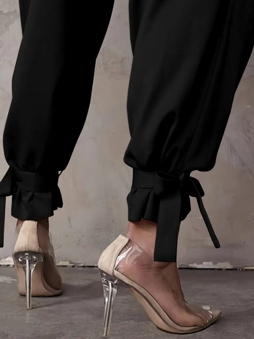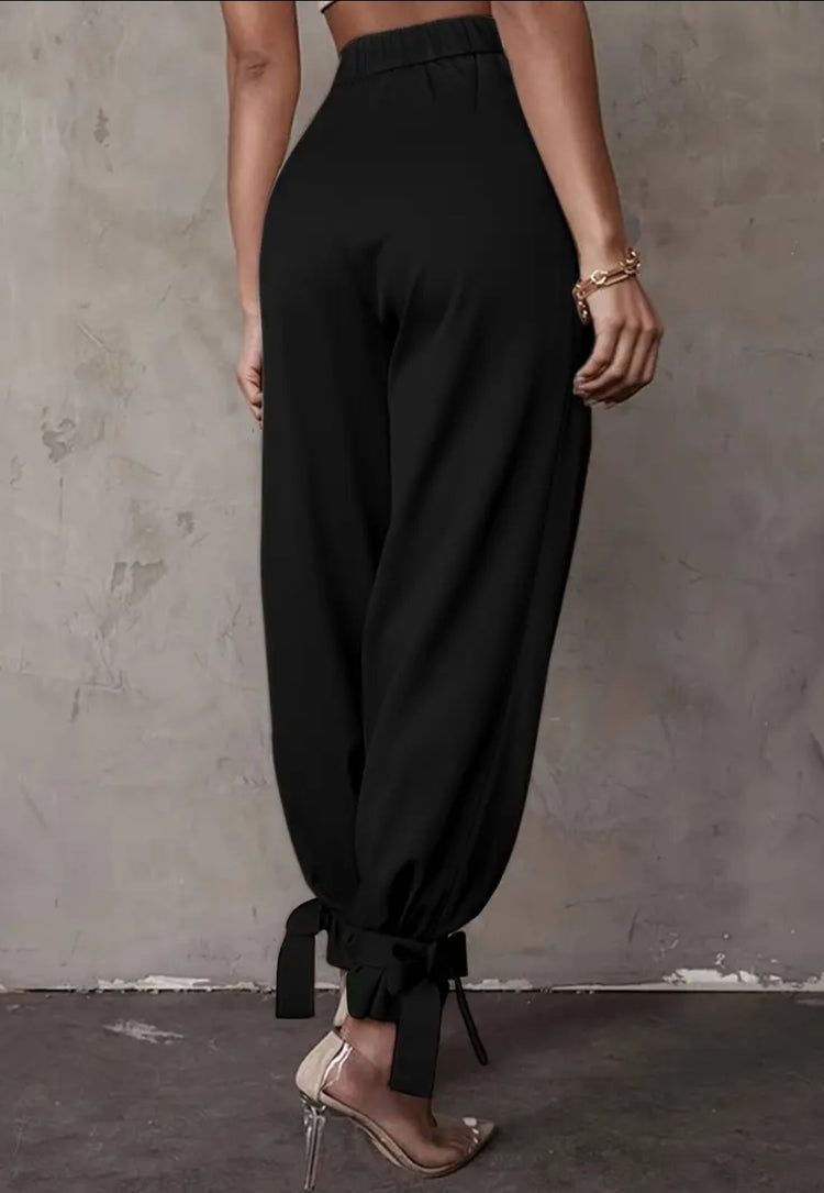Nämä Tied Bow Elegance Pants yhdistävät klassisen eleganssin ja modernin leikkisyyden. Housujen näyttävät rusettilahkeet tuovat naisellista kontrastia minimalistiseen mustaan sävyyn. Korkea vyötärö imartelee vartaloa ja tekee housuista täydelliset niin toimistolle kuin iltamenoihinkin. Yhdistä esimerkiksi siistiin paitaan, bleiseriin tai paljettipaitaan – ja olet valmis valloittamaan päivän (tai yön) tyylillä. ✨