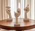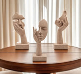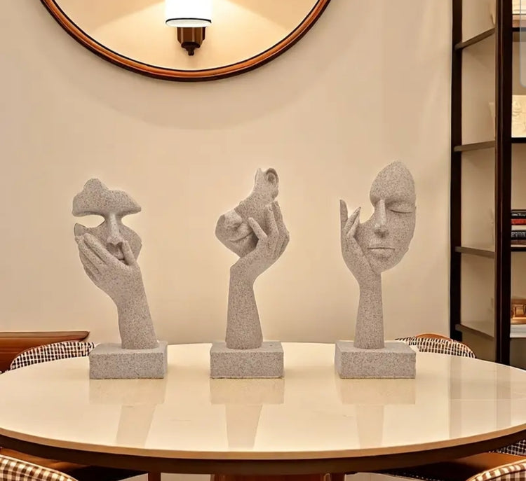 Kolmen hartsipatsaan setti, jossa modernit, abstraktit kasvo- ja kämmenaiheet tuovat taiteellista tunnelmaa kotiin. Minimalistinen muotoilu ja hiekkakivimainen pinta sopivat täydellisesti olohuoneeseen, toimistoon tai lahjaksi taiteen ystävälle. Mitat: 16–17 cm korkea, 5,8 cm leveä. Materiaali: hartsi.