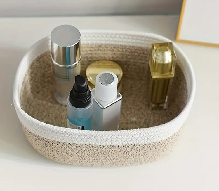 Käsinkudottu pieni säilytyskori, joka huokuu luonnollista kauneutta. Valkoisen ja nuden sävyt luovat harmonisen ilmeen, joka sopii moneen sisustustyyliin. Kori on kooltaan 20 cm pitkä, 11 cm korkea ja 15 cm leveä – täydellinen pienten tavaroiden järjestelyyn tyylillä.
