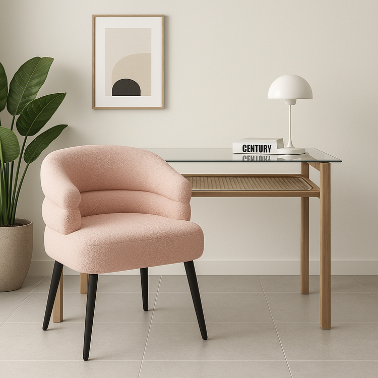 Tyylikäs ja ilmava LINA työpöytä yhdistää luonnonmateriaalien lämmön ja modernin muotoilun. Pöydän lasikansi tuo tilaan keveyttä ja korostaa alla olevaa kauniisti punottua rottinkihyllyä, joka toimii kätevänä säilytystilana vaikkapa lehdille tai tarvikkeille. Kompaktit mitat (110 x 65 x 74 cm) tekevät siitä ihanteellisen valinnan niin kotitoimistoon kuin makuuhuoneen nurkkaukseen. Mustat yksityiskohdat ja puun sävyt viimeistelevät harmonisen kokonaisuuden.