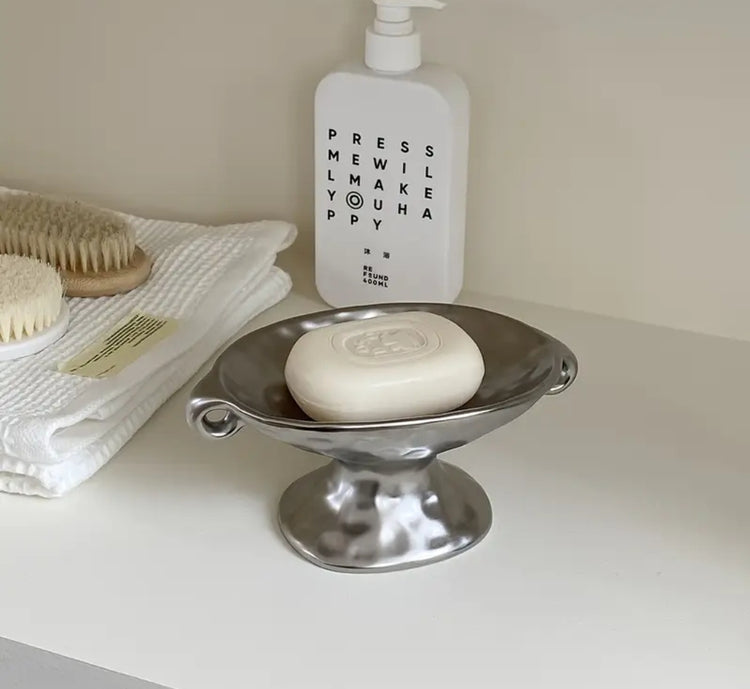 Molten Metal Soap Dish on moderni ja näyttävä lisä kylpyhuoneen sisustukseen. Epäsymmetrinen muoto ja sulanutta metallia muistuttava pinta tekevät tästä saippuakupista todellisen katseenvangitsijan. Mått: 18,5 cm x 11 cm, korkeus 8 cm. Sopii täydellisesti saippuan, korujen tai muiden pienten kylpyhuonetarvikkeiden säilytykseen. Elegant valinta niin minimalistiseen kuin boheemiin kylpyhuoneeseen.