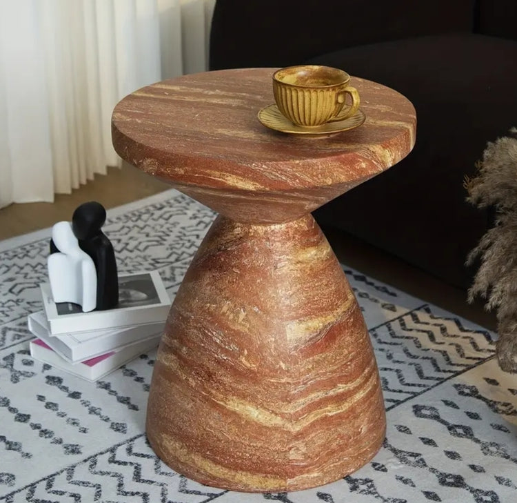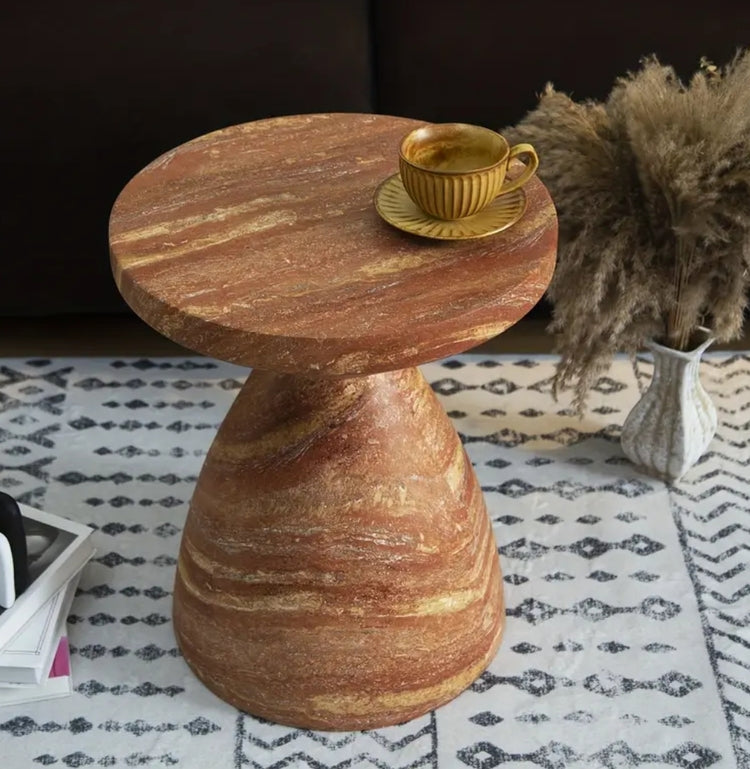 Rustic Marble Side Table on moderni ja näyttävä pyöreä pöytä, joka tuo luonnollista eleganssia kotiin tai terassille. Kompakti koko (Ø45 cm, korkeus 54 cm) tekee siitä täydellisen sivupöydän olohuoneeseen, makuuhuoneeseen tai kahvilaan. Valmistettu kestävästä puumateriaalista ja viimeistelty punaruskealla marmorikuosilla, joka luo ainutlaatuisen ja taiteellisen ilmeen. Ei vaadi kokoamista – helppo ottaa heti käyttöön. Sopii niin sisä- kuin ulkokäyttöön ja toimii erinomaisesti sohvan vieressä, sängynpäätypöytänä tai kahvipöytänä.