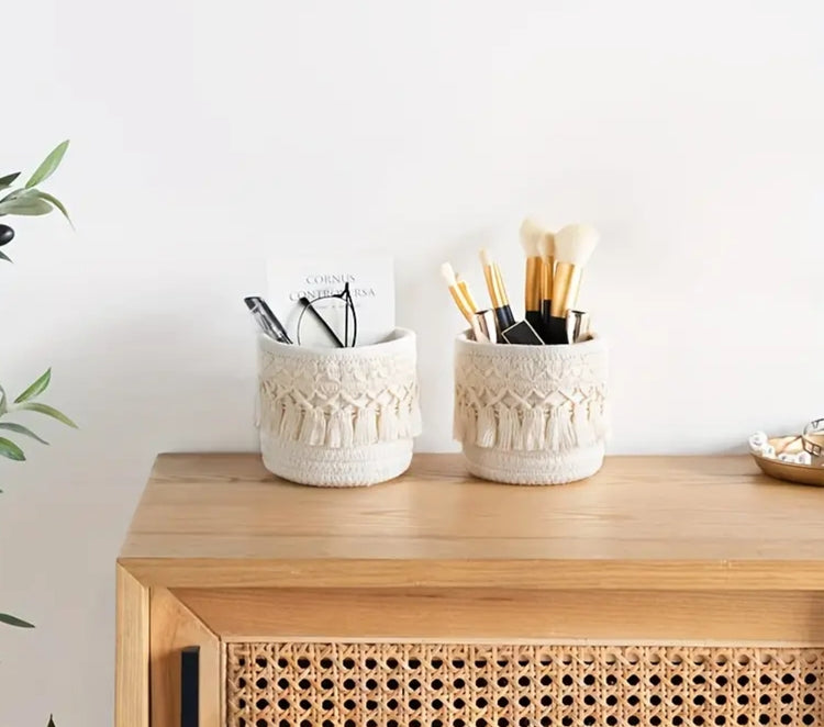 Käsinkudottu olkinen säilytyspussi, jossa tyylikkäät hapsut tuovat boheemia ilmettä. Sopii täydellisesti esimerkiksi siveltimien säilytykseen. Koko: korkeus 10 cm, vallar 12 cm. Hypoallerginen. Käytännöllinen ja kaunis lisä arkeen!