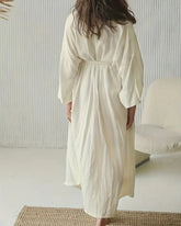 Serene Kimono Dress on täydellinen yhdistelmä eleganssia ja rentoutta. Pehmeä, kevyesti laskeutuva kangas tuntuu miellyttävältä iholla, ja väljä kimonomallinen leikkaus tekee mekosta ilmavan ja tyylikkään. Vyötäröllä oleva solmittava nauha korostaa kauniisti muotoja, ja luonnollinen vaniljainen sävy sopii täydellisesti harmoniseen, minimalistiseen tyyliin.
