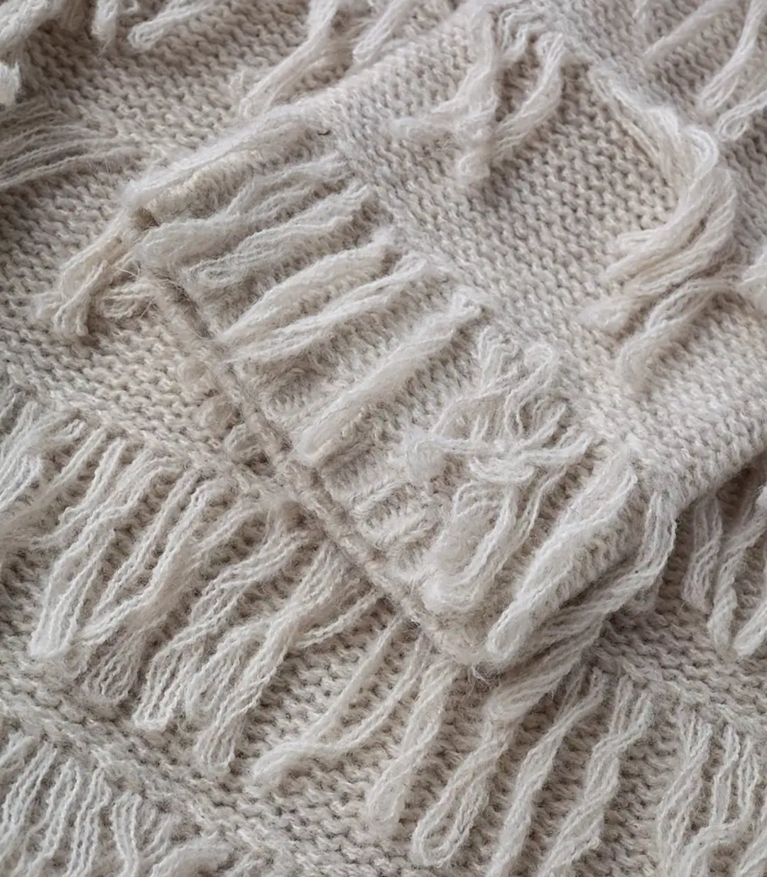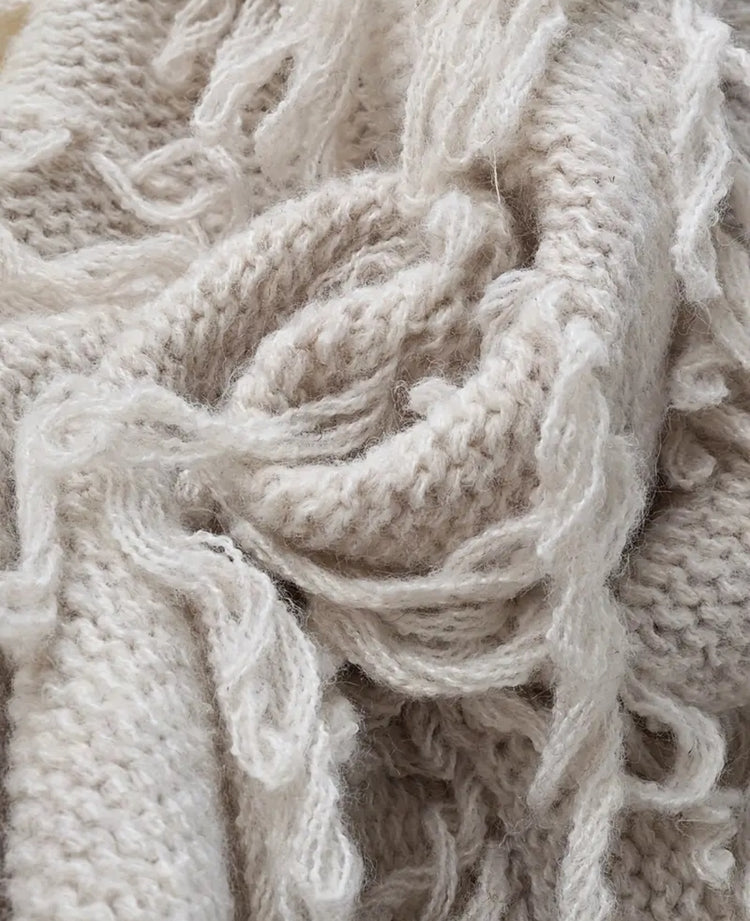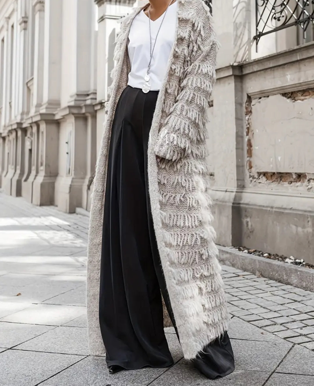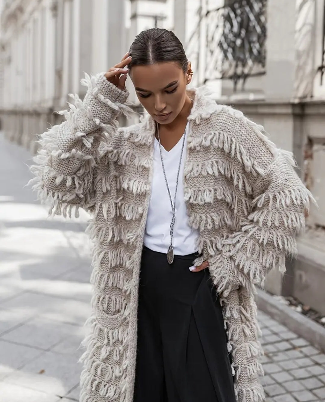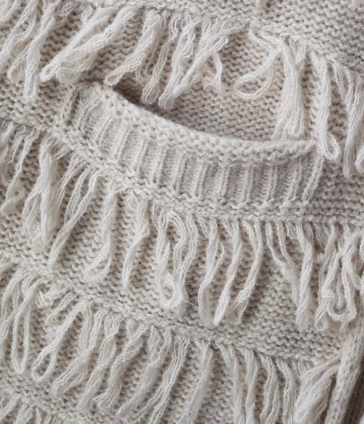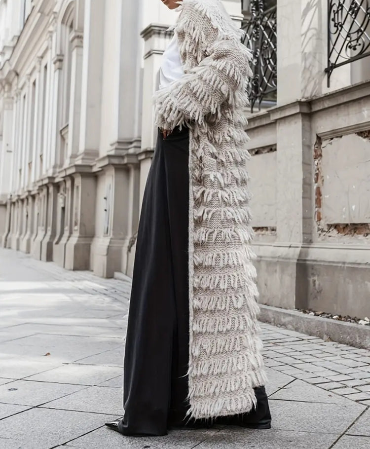 Tämä näyttävä pitkä Boho Luxe -neuletakki on täydellinen yhdistelmä rentoa boheemia fiilistä ja luksuksen tuntua. Pehmeä, lämpimän sävyinen lanka ja bohotyyliset hapsuyksityiskohdat tekevät siitä asun, joka kääntää katseet.