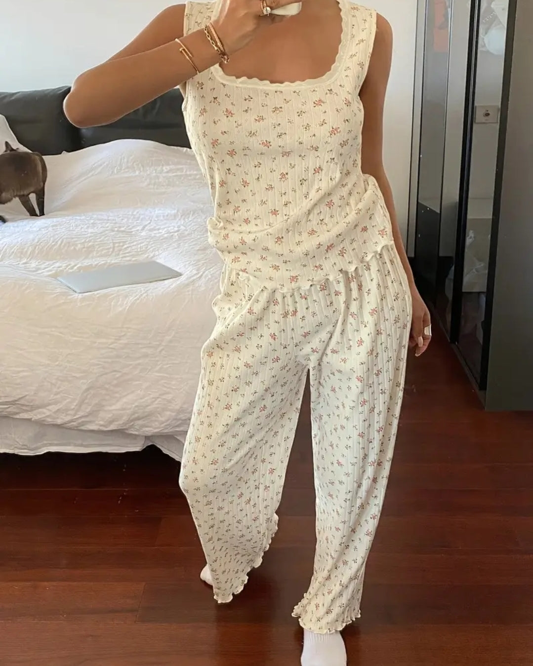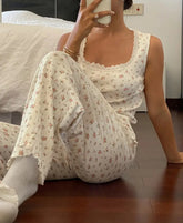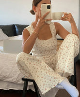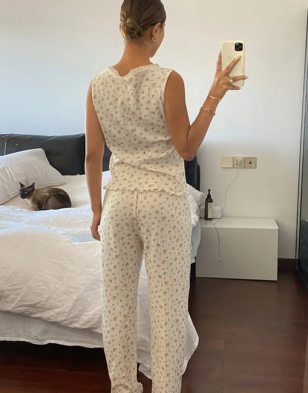Flora Lounge Set on täydellinen yhdistelmä mukavuutta ja naisellista kauneutta. Pehmeästä joustavasta puuvillasekoitteesta valmistettu kaksiosainen setti sisältää leveälahkeiset housut ja pitsireunaisen toppin, jotka tekevät kotona oleilusta, nukkumisesta tai rauhallisista aamuhetkistä entistä ihanampia. Suloinen kukkakuosi ja kevyt materiaali tuovat romanttista fiilistä arkeen.